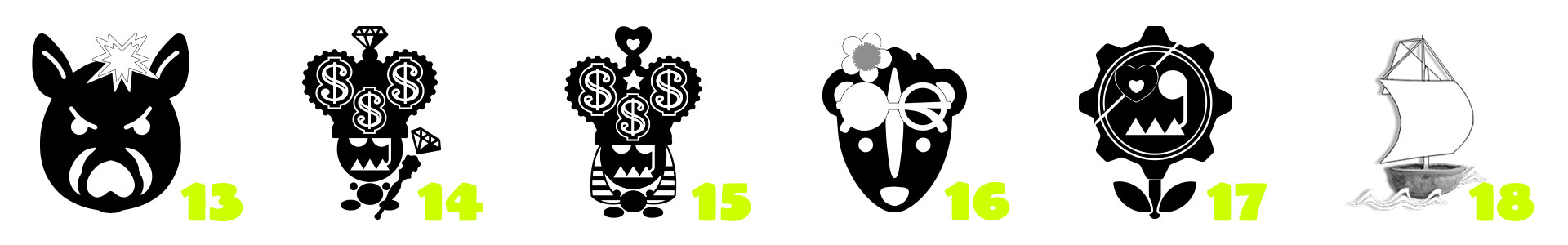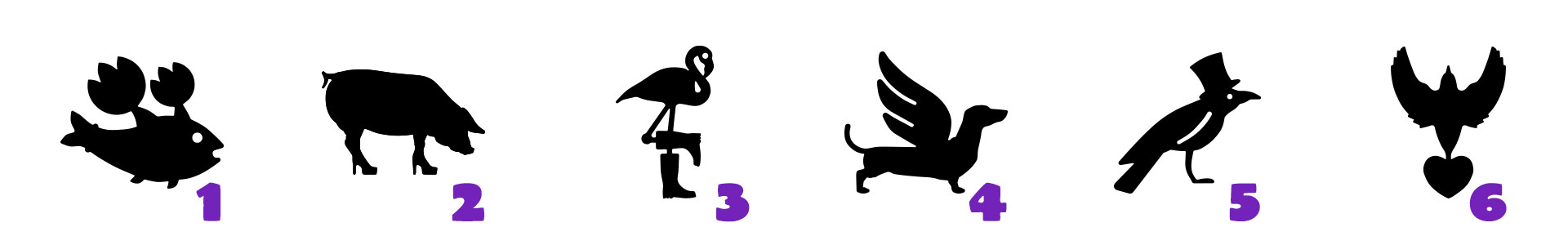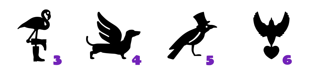 PROTAGONISTI / 1. MAGIC KOI LA CARPA FIORE / 2. GLITTER PIG / 3. Mr CROQUET IL FENICOTTERO FENICE / 4. CHERUBINO / 5. DAVID IL CORVO ALCHIMISTA / 6. CUORE DI PIUMA