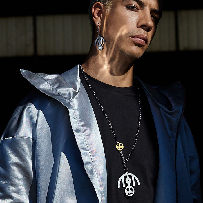 collana / ciondolo 7.0 cm in alluminio riciclato con gancio / logo OGM oro diametro 2.0 cm in alluminio riciclato / catena chiusa color antracite circonferenza 80 cm / confezionato in vasetto di vetro con cofanetto / prodotto in Italia