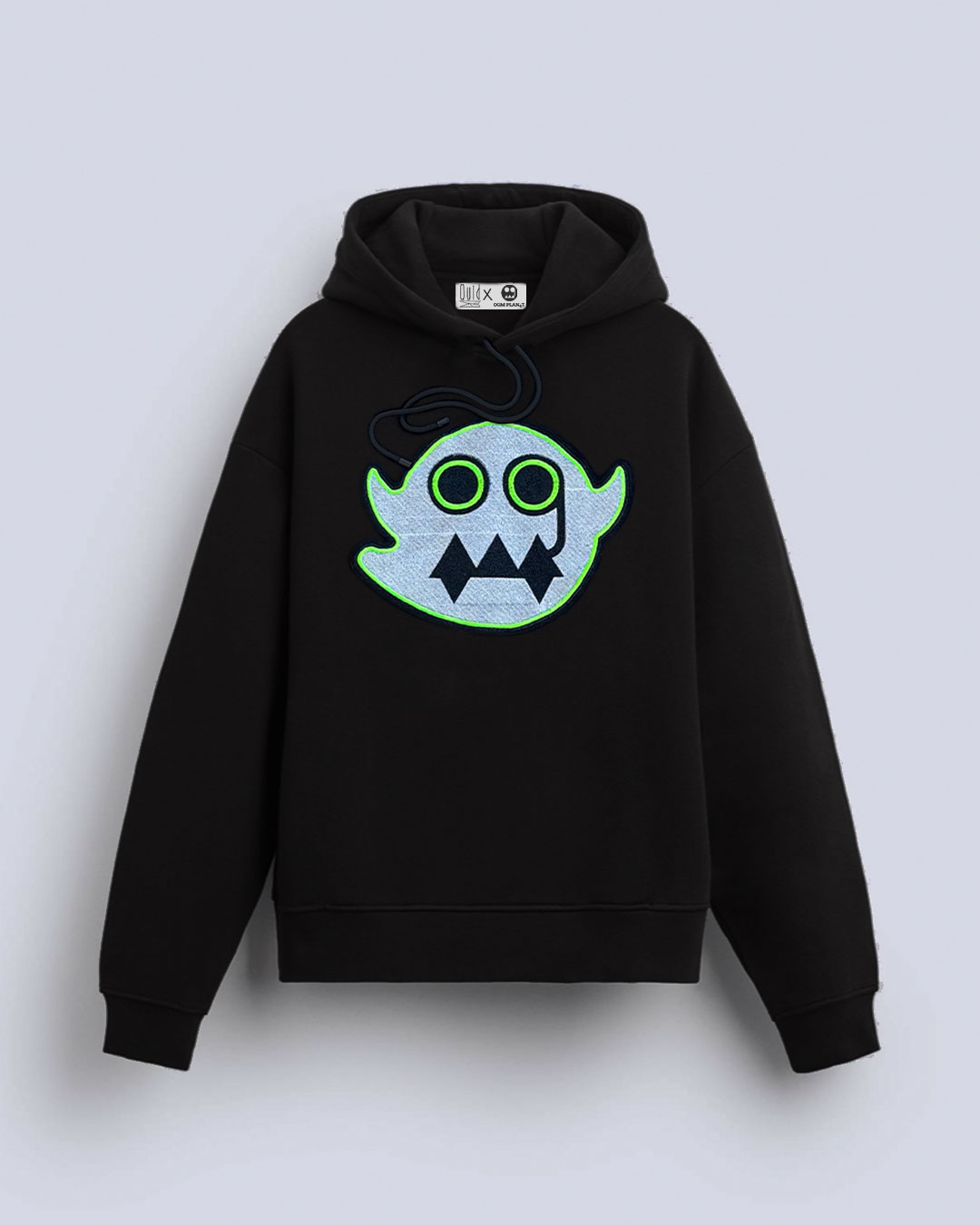 Felpa genderless in cotone nero con maxi ricamo patch in filo metallizzato.