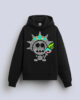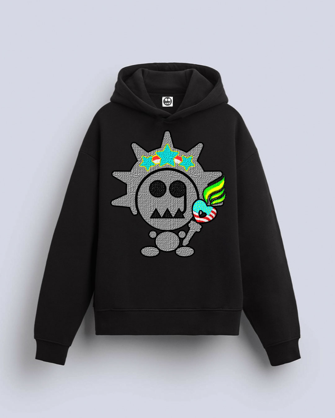 Felpa genderless in cotone nero e applicazione patch ricamo in filo di alluminio.