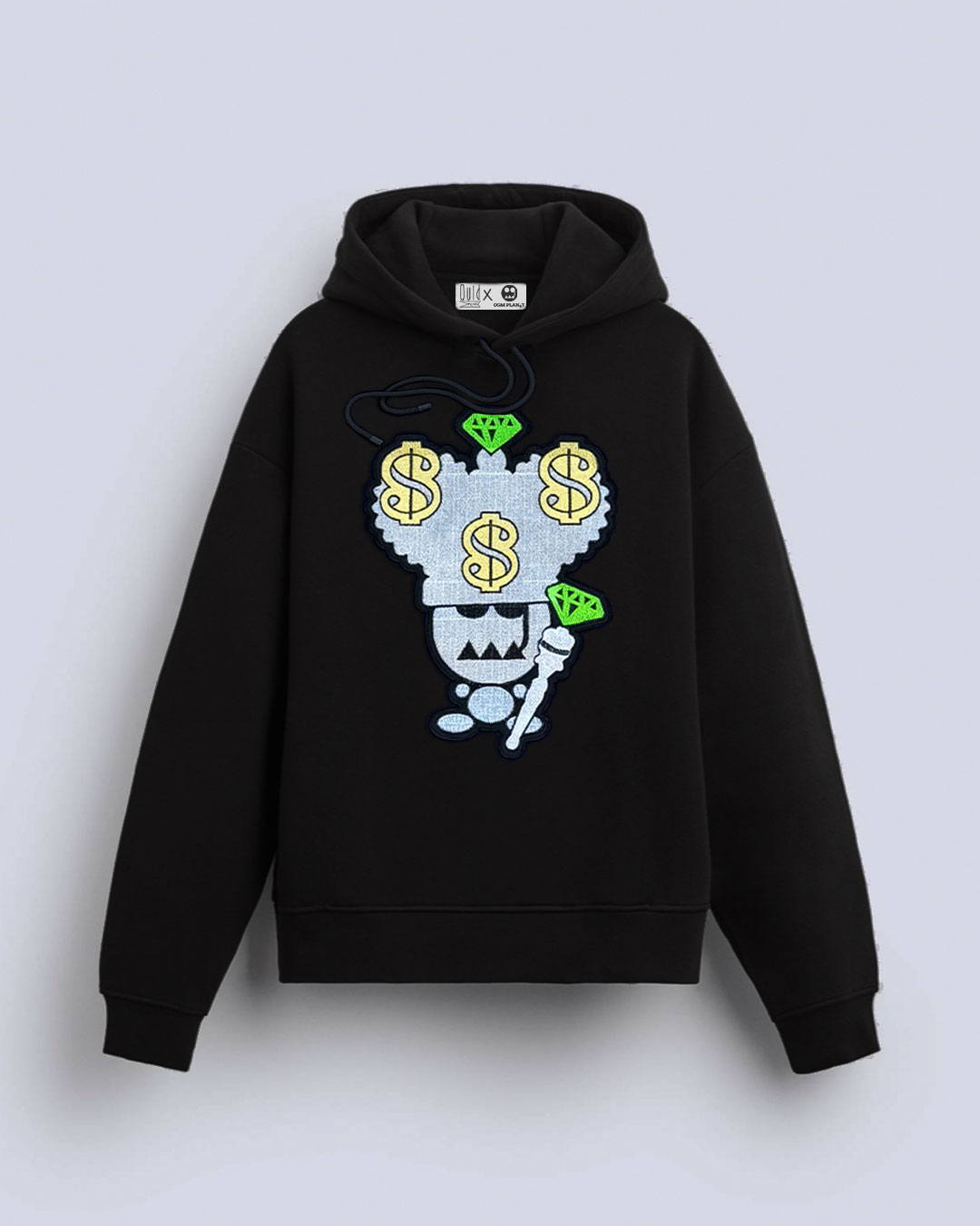 Felpa genderless in cotone nero con maxi ricamo patch in filo metallizzato.